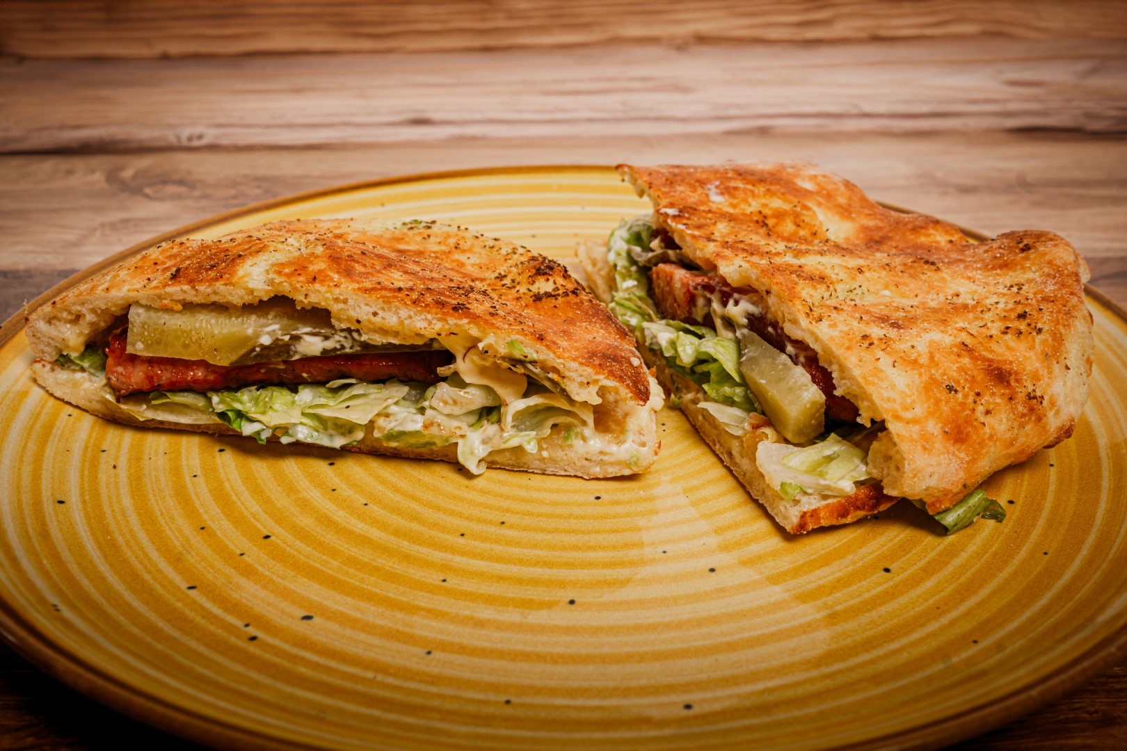 Panini,salata iceberg,carnati macelaresti,castraveti murati,sos de mustar