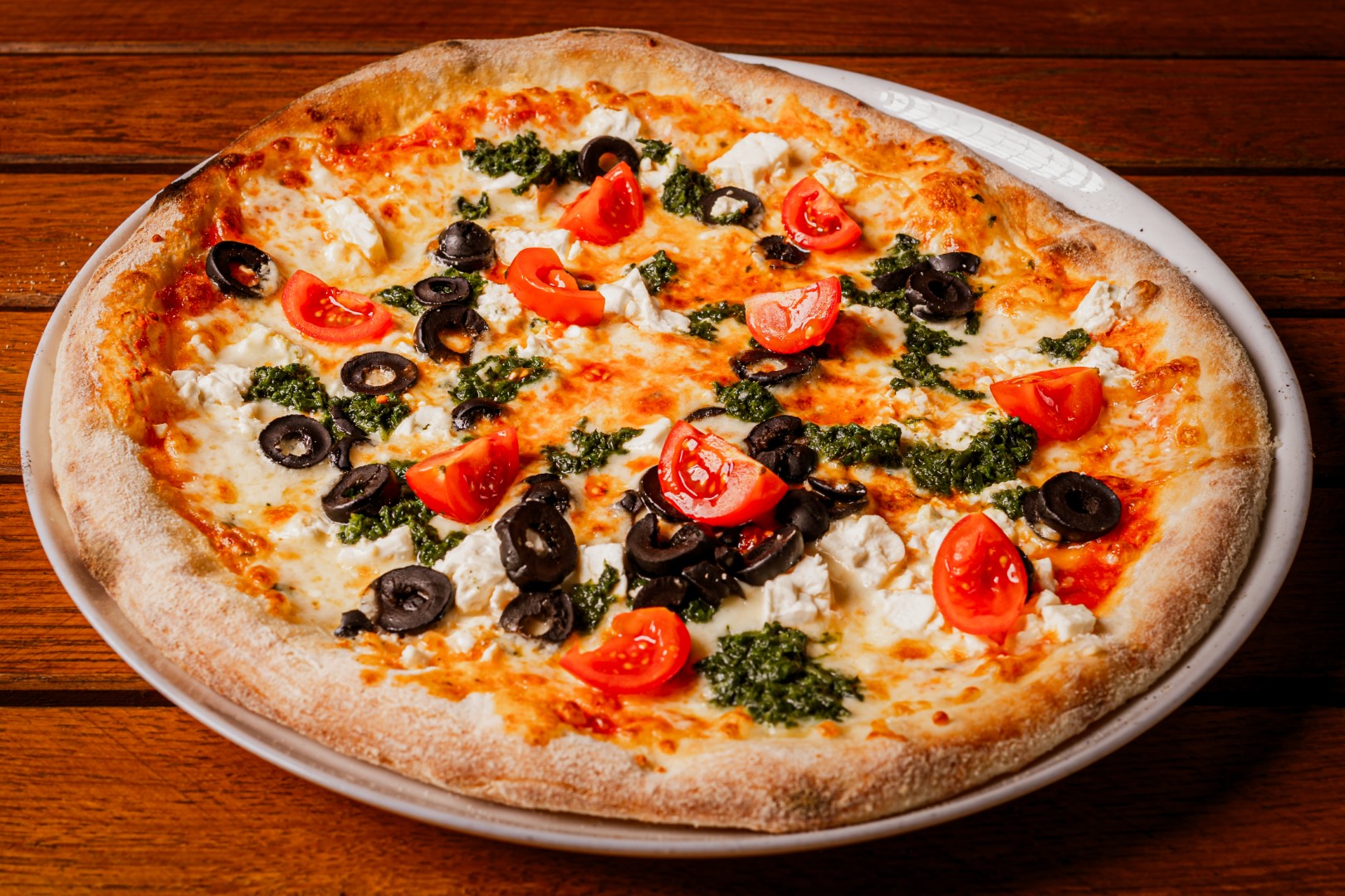 Blat de pizza,sos de pizza,mozzarella,fetta,spanac,masline,rosii cherry