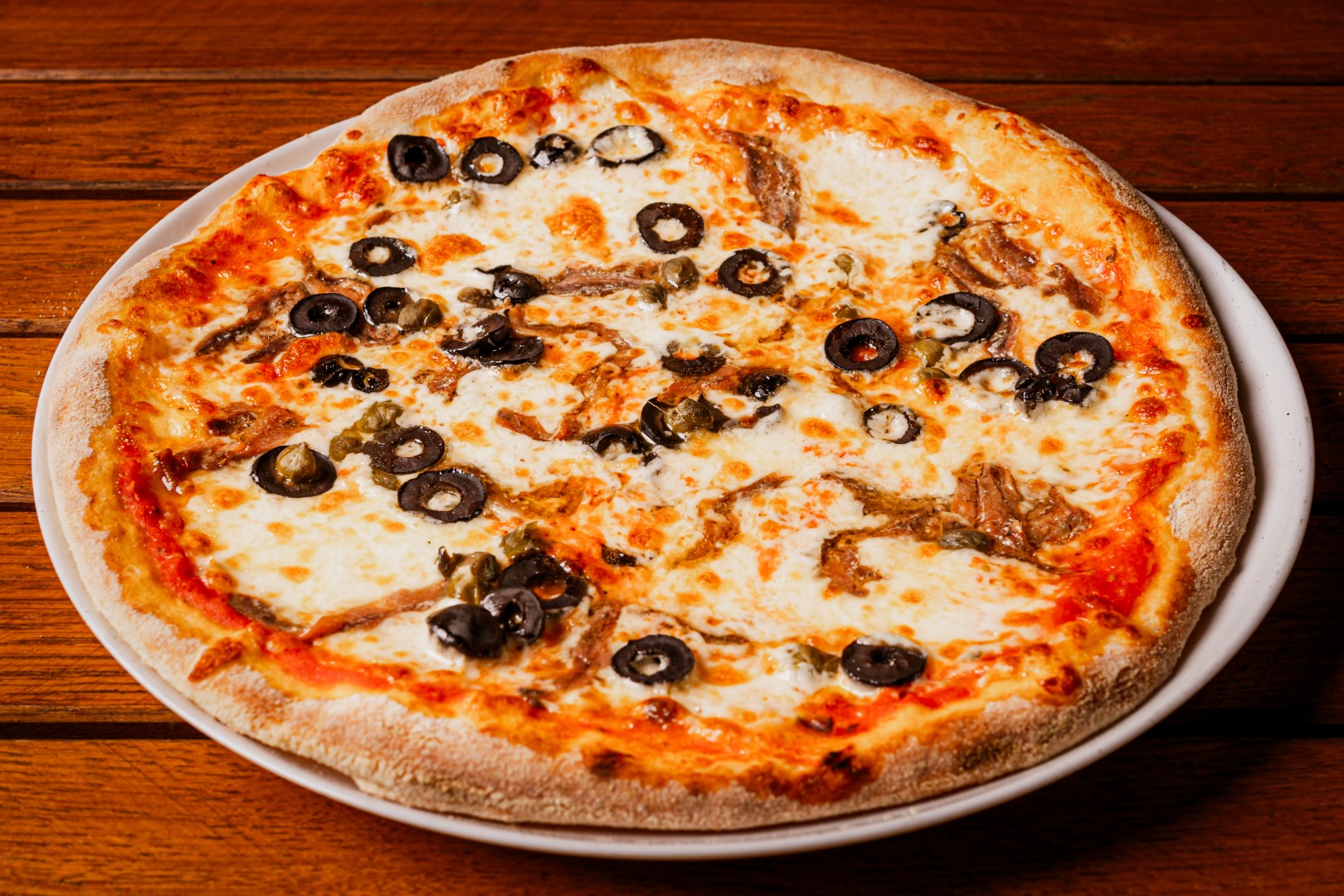 Blat de pizza sos de rosii ,mozzarella.ansoa,capere,masline