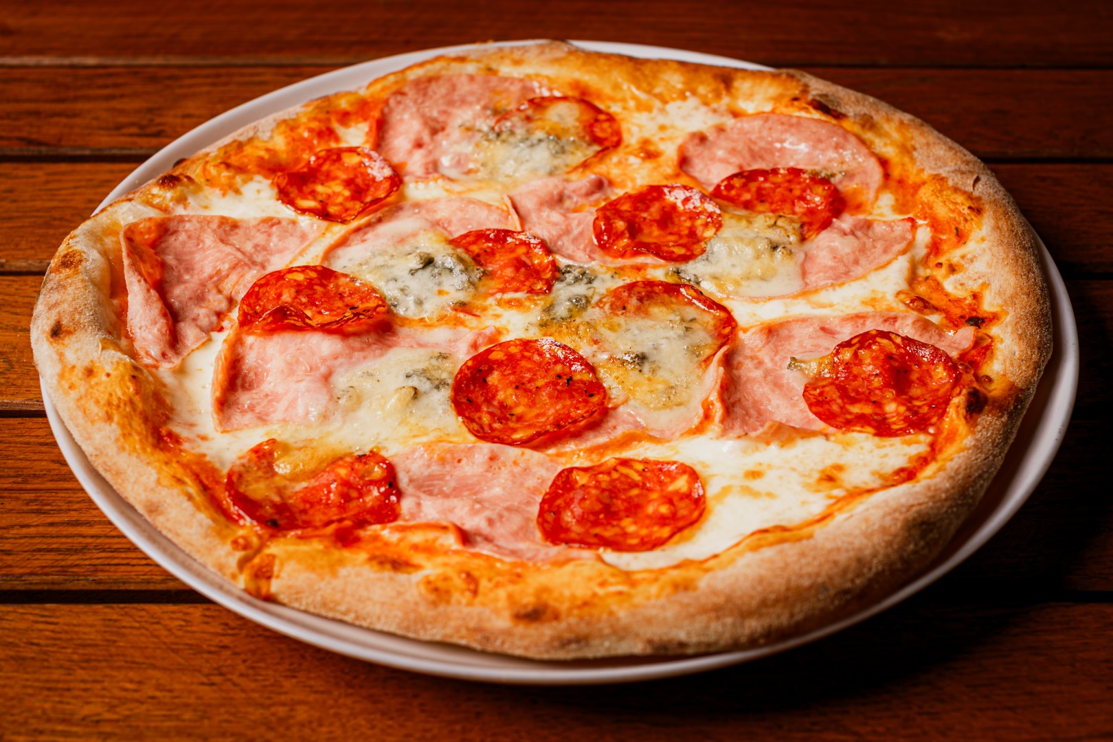 Blat de pizza sos de rosii ,mozzarella gorgonzola ,chorizo, prosciutto cotto