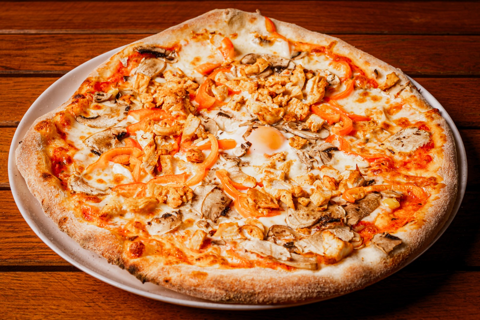 Blat de pizza,sos de rosii,mozzarella,piept de pui,ou,ardei gras ,ciuperci