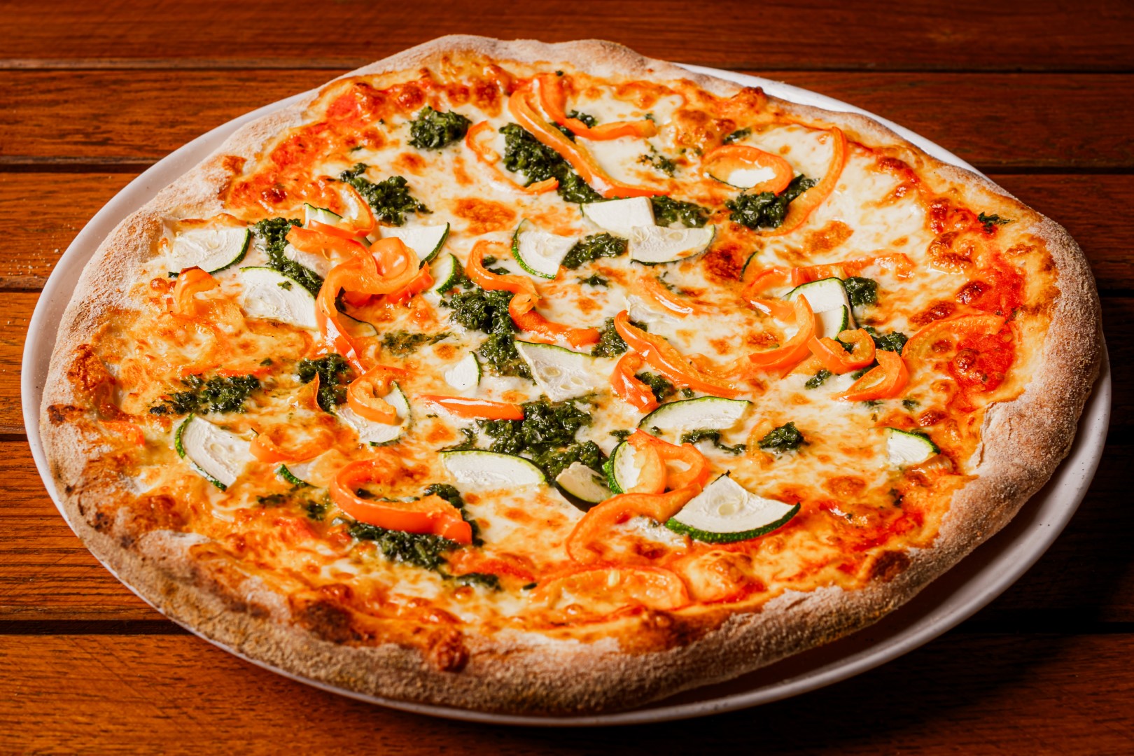 Blat de pizza sos de rosii ,mozzarella spanac,zucchini,ardei gras