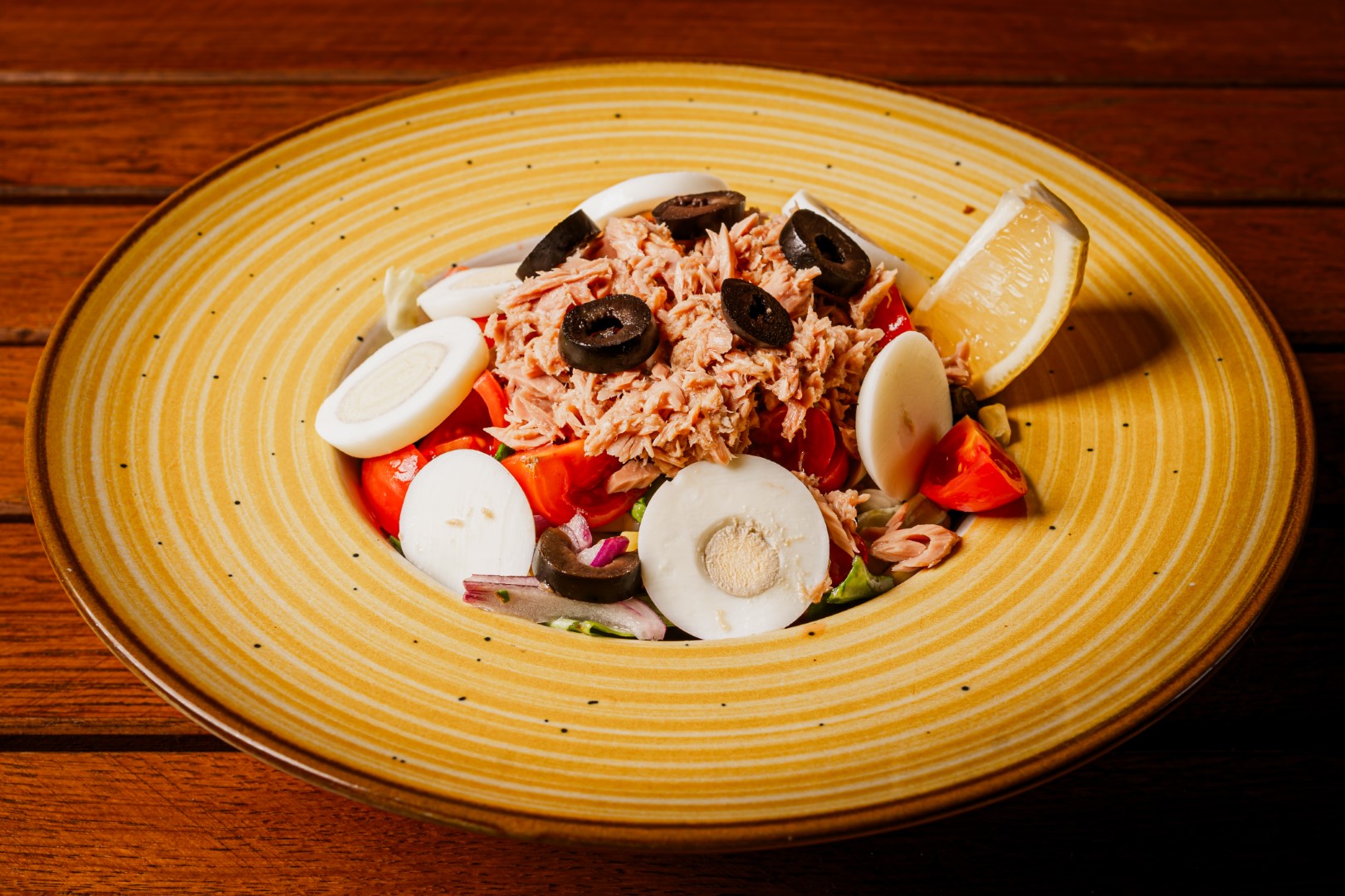 Mix de salata verde ,ton ou fiert,rosii cherry,ceapa rosie,porumb,masline, lamaie,ulei de masline